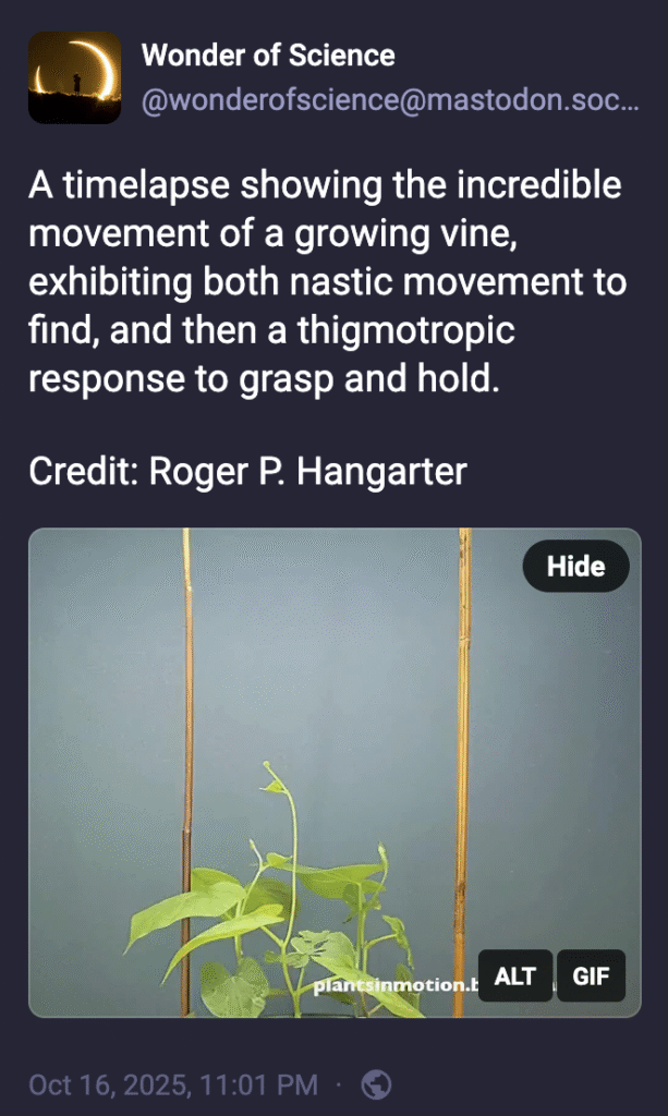 Unfortunately, I could not find the original source as the site quoted (plantsinmotion.bio.indiana.edu) is currently offline. I’m posting a screenshot of the original toot here which credits Roger P. Hangarter for the video.